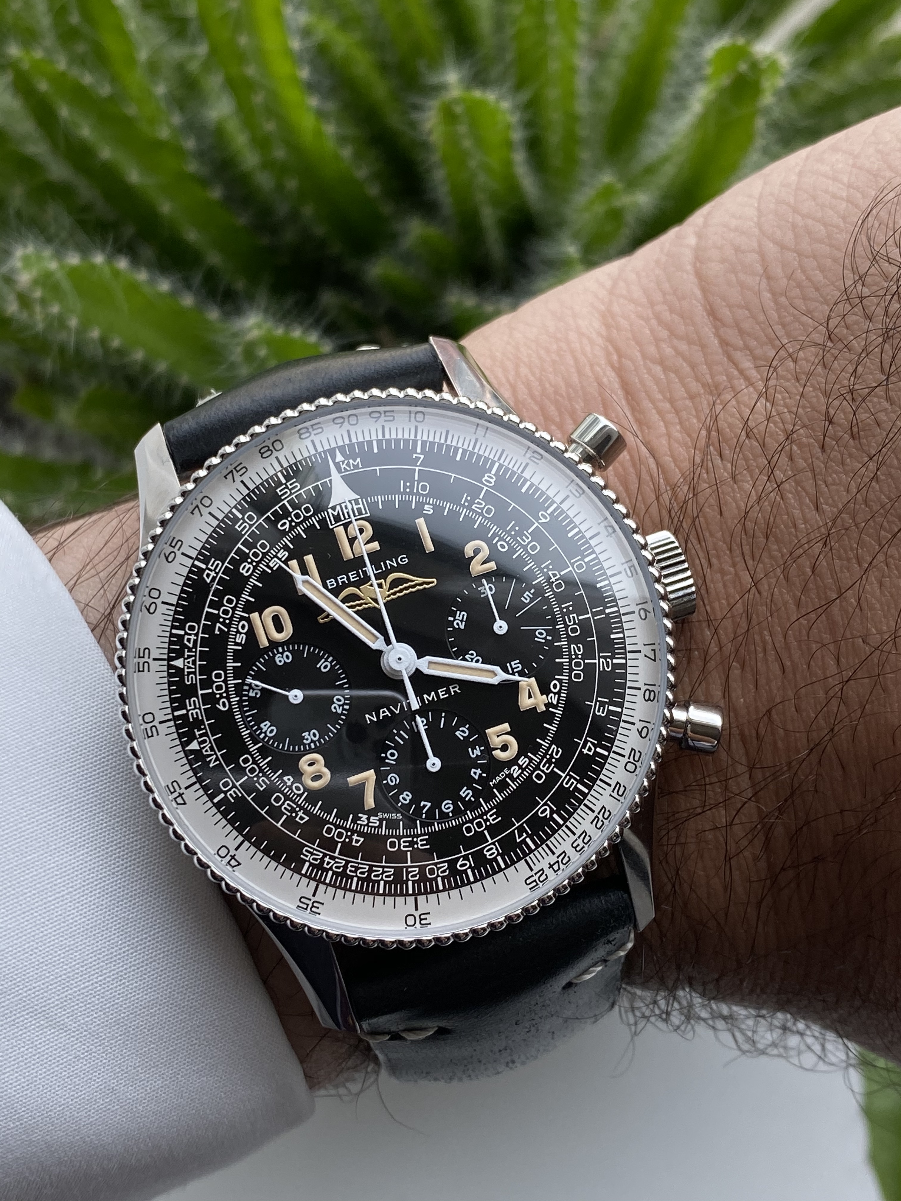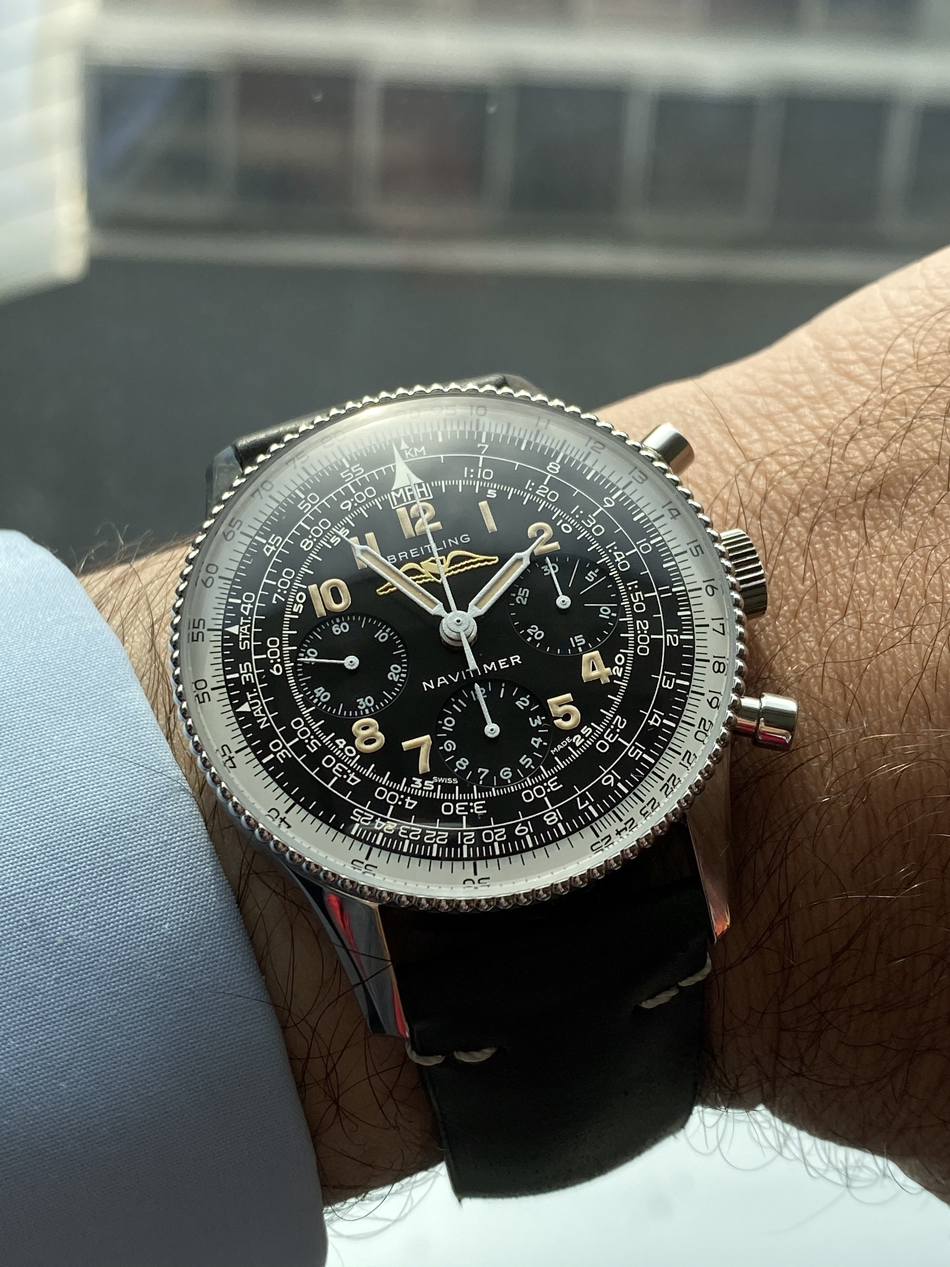 The dial is fantastic. A lot of retro, 50's and 60's vibes in a wearable size (not a big fan of the huge navitimers but obviously the size depends on your wrist. I also like the IWC big pilot that is 46mm so..it depends!)