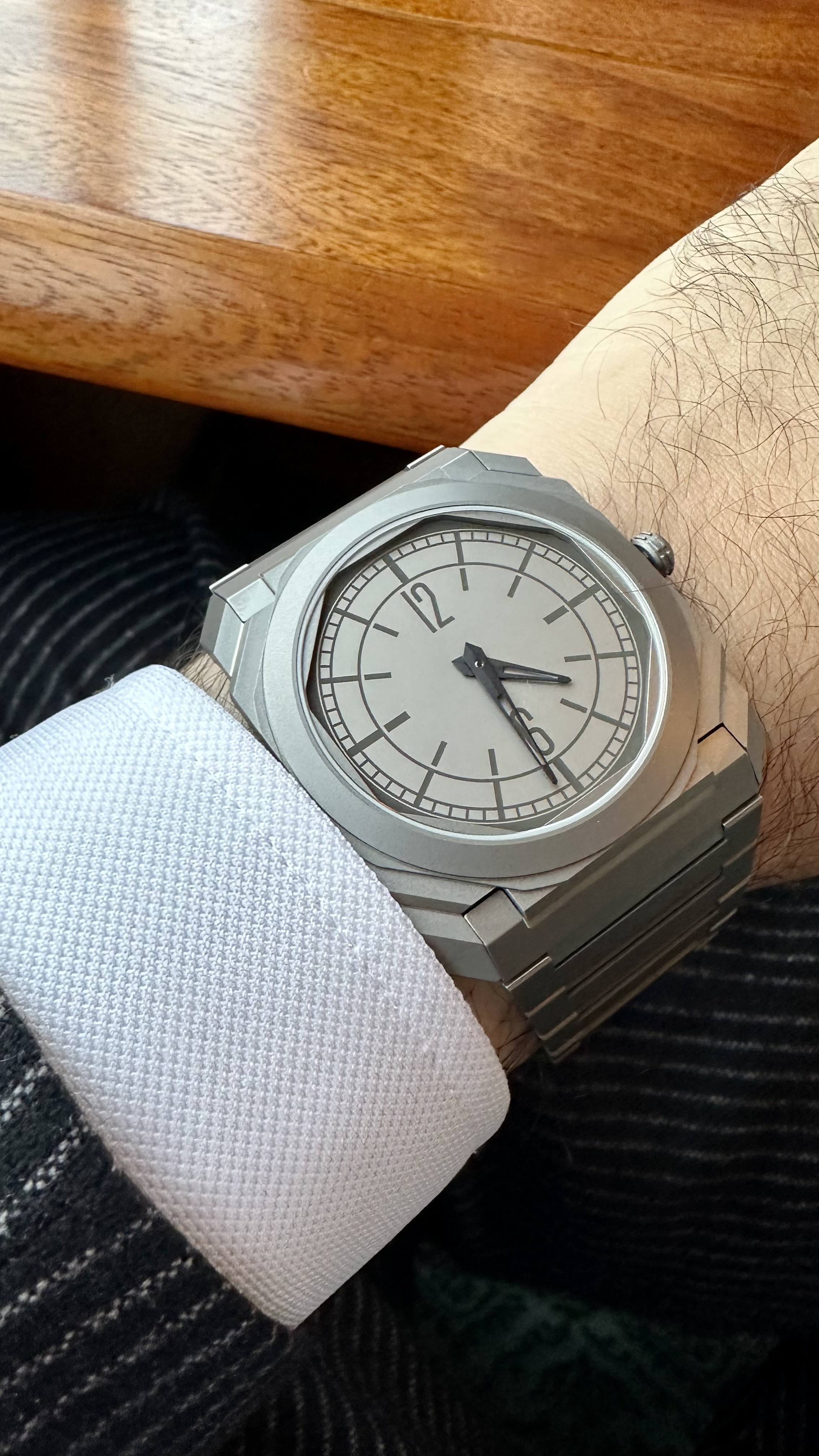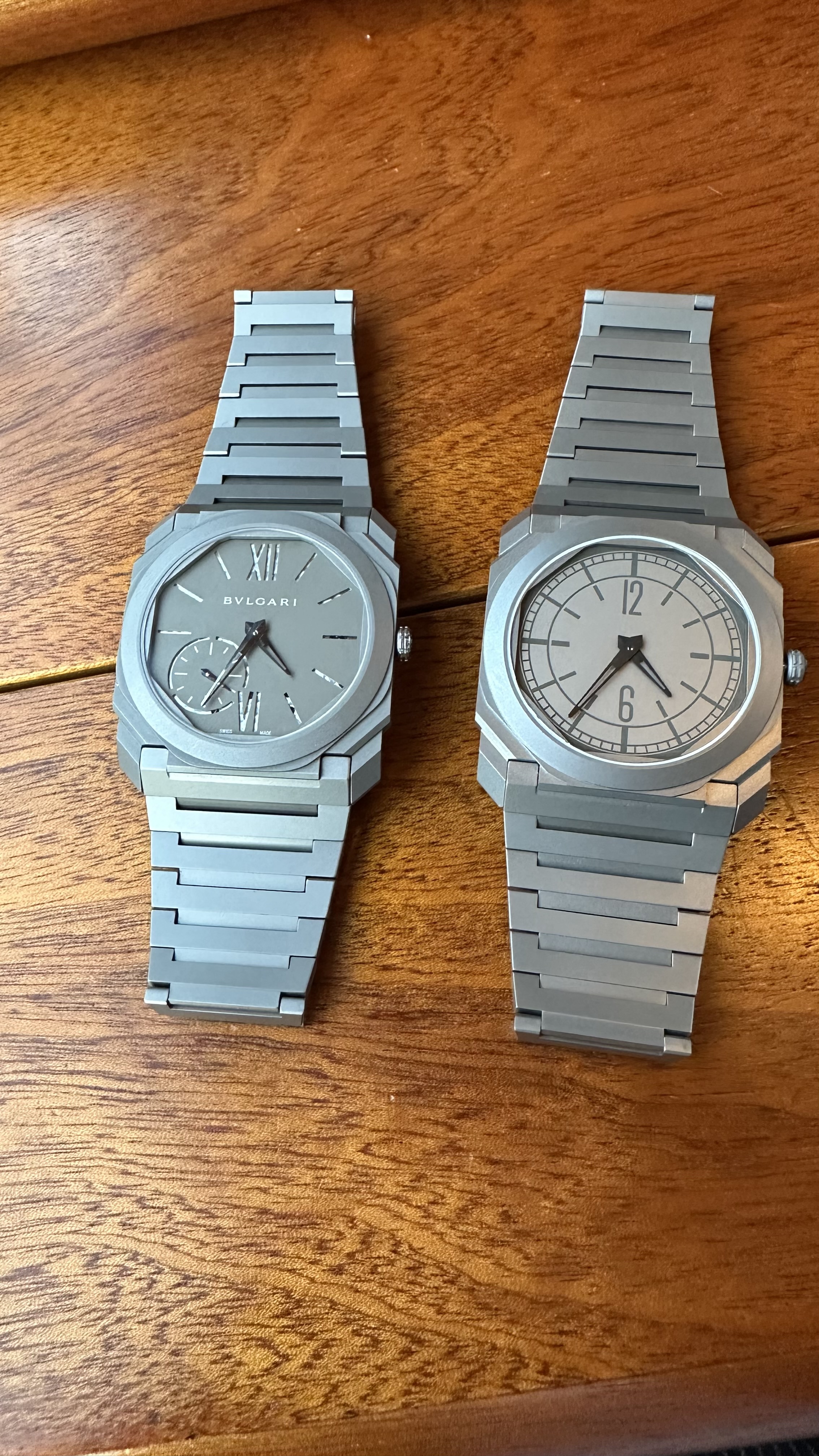The main difference of this special edition is the unusual (for an Octo Finissimo) sector dial without the bulgari brand and the offset seconds of other models. According to Aurel Bacs of Bacs & Russo "We wanted to draw the focus on the engraved dial" .. "with its large numerals and the chapter ring whose color sways from black to grey to bronze, depending on the lighting."