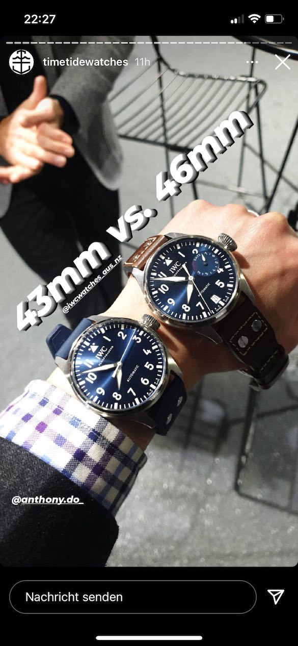 In this year IWC launched a smaller version of the big pilot: 43MM vs 46.2MM as you can see side by side in this intagram post (all rights to the original poster)