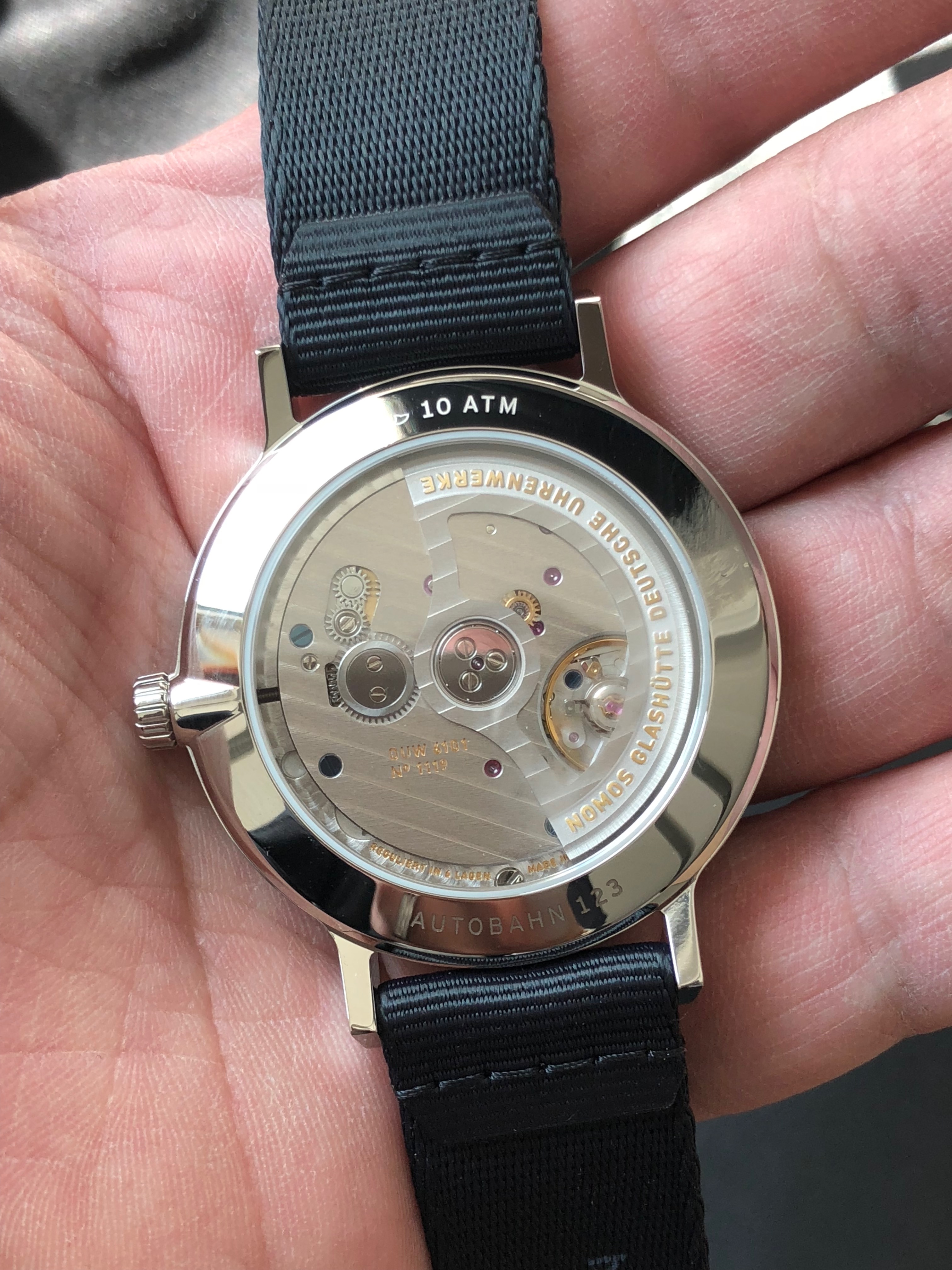The Nomos autobahn is powered by the new in-house DUW 6101 caliber that allows for a quick set of the data in both directions. It is a new automatic movement that also features the swing system escapement. In our view one of the strengths of nomos watches is the in-house movements and in this case the bi-directional date set is a very practical feature.