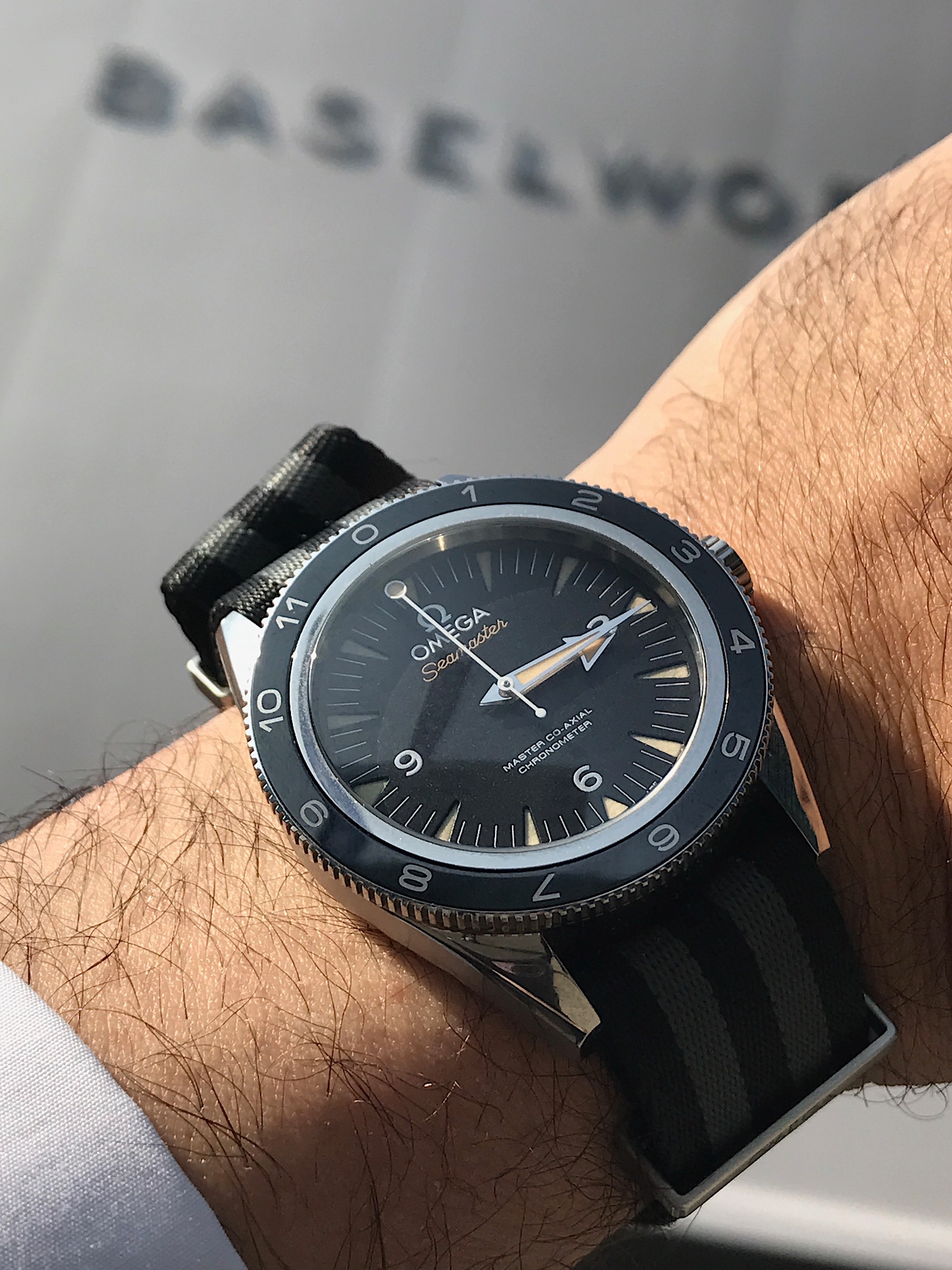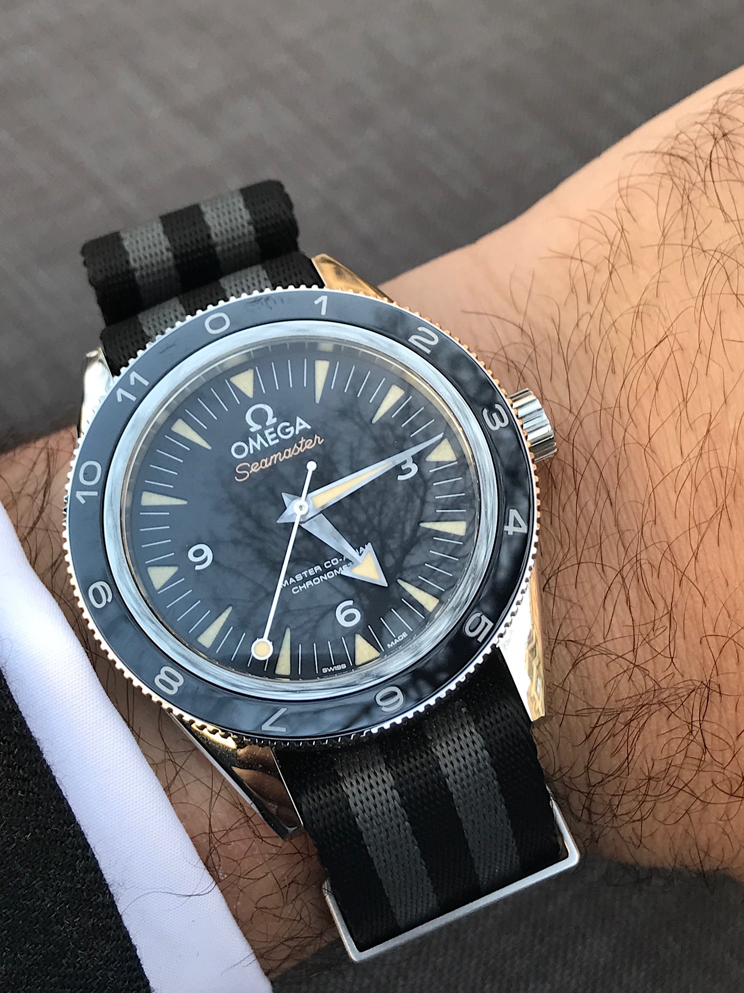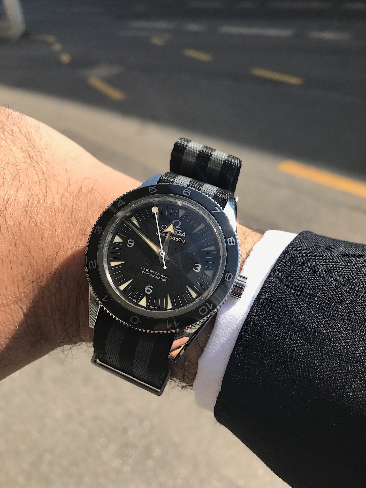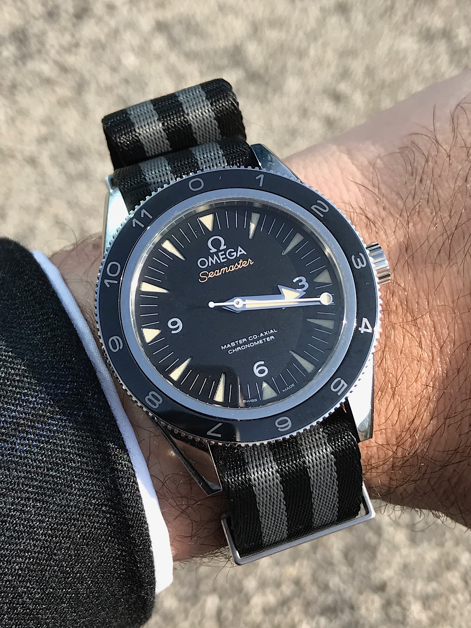 Now this photo alone suggest that this watch is not just another sporty limited edition but the quintessential bond watch (with the revised nato strap in grey and black) that would work very well with a suit. If is good enough for James Bond, it is good enough for the boardroom.