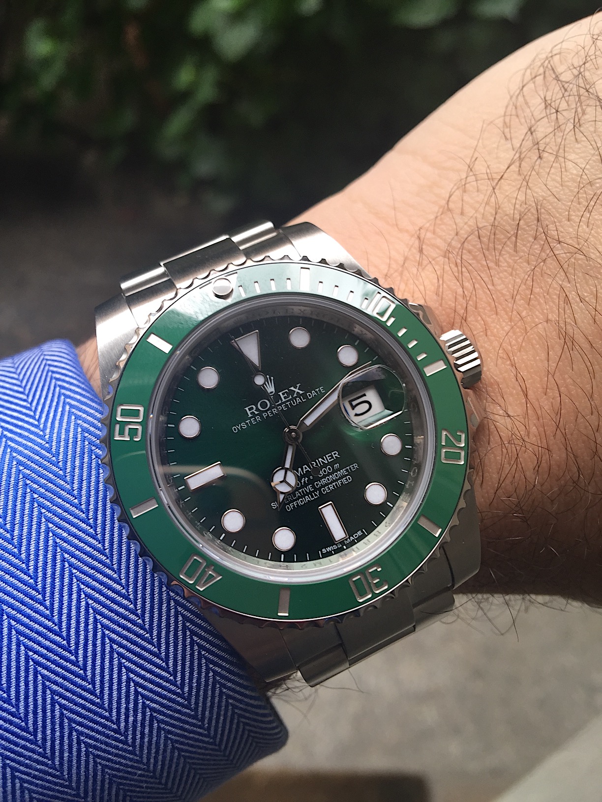 Few watches are as versatile, reliable and great looking as the Rolex Submariner. Launched originally in 1953 it has been updated several times. One of the latest version is the green (which, due to its color has the nickname of "hulk") that you can see in the live picture here: