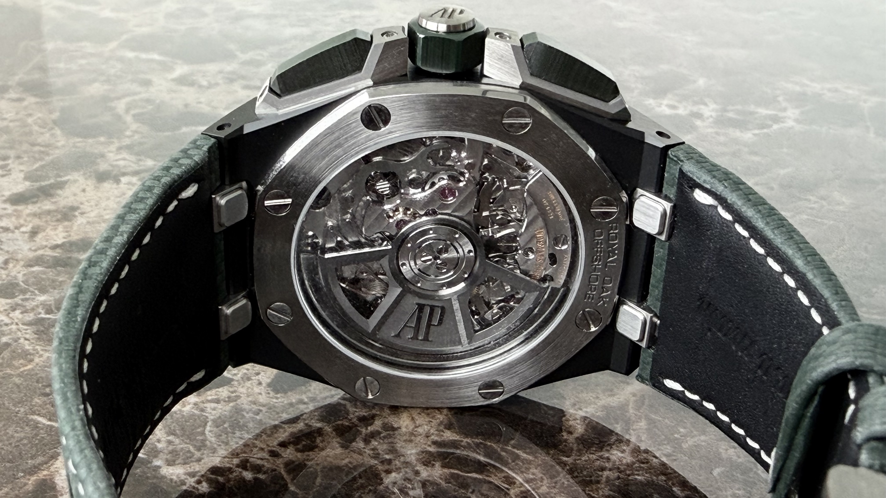 I visited the local AP house without looking for a specific watch but to check what was available a few years after the "old sold out" market hype for anything Audemars. I had the chance to try a few Code 11.59 watches—which could be seen as charming in their own right—but also a few Royal Oak Offshores that were available for purchase. The Audemars Piguet Royal Oak Offshore Ref. 26420CE.OO.A063VE.01 caught my eye immediately as the black ceramic case combined with the forest dark green makes the watch appear more understated and somehow smaller. I loved the look and, comparing it with the 42mm, it appears more comfortable thanks to the new case construction that is slightly curved and fits better on the wrist. The all-ceramic chronograph pushers remind me of the construction of the AP concept watches—so much more futuristic than the historic 42mm.
