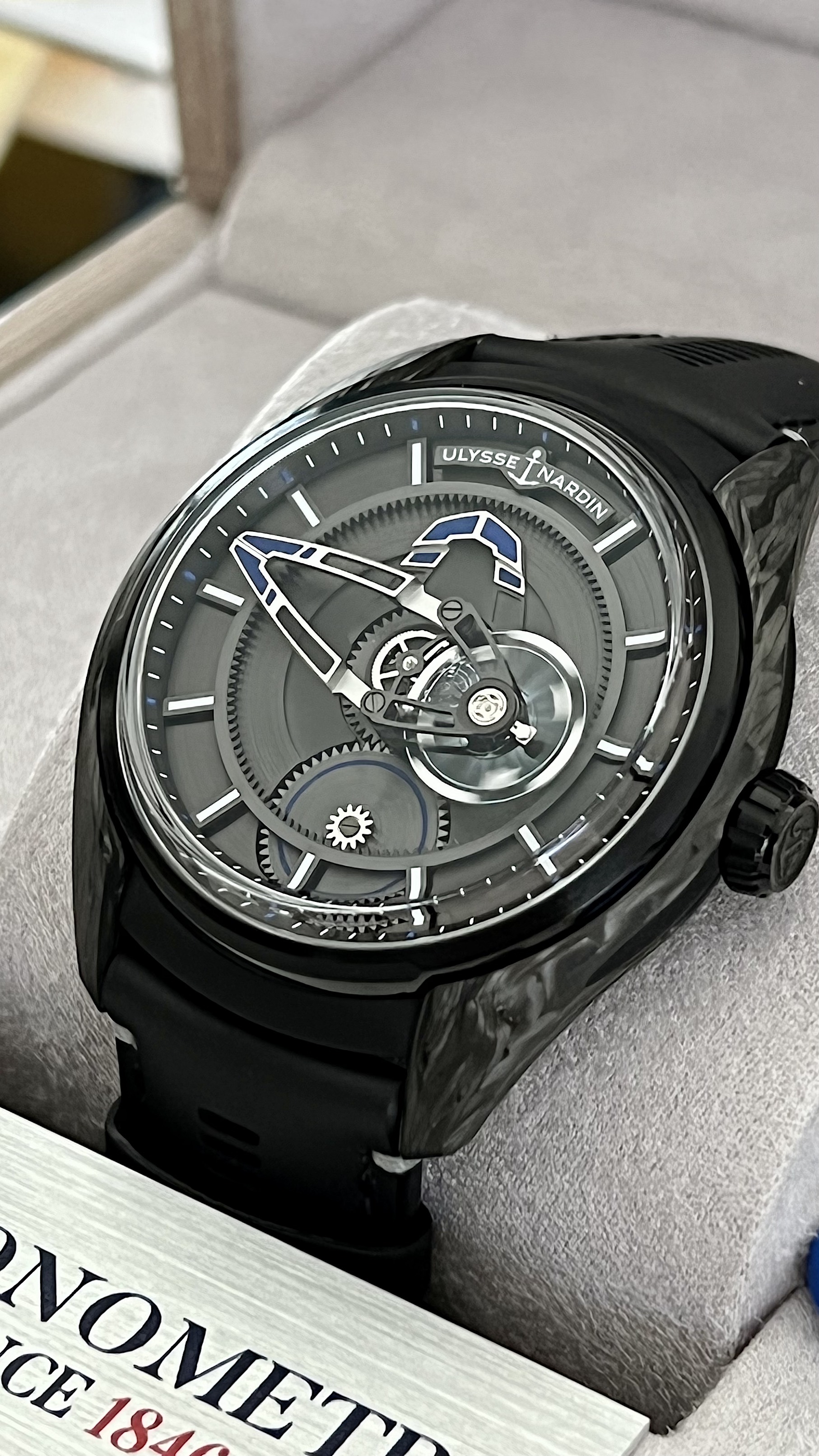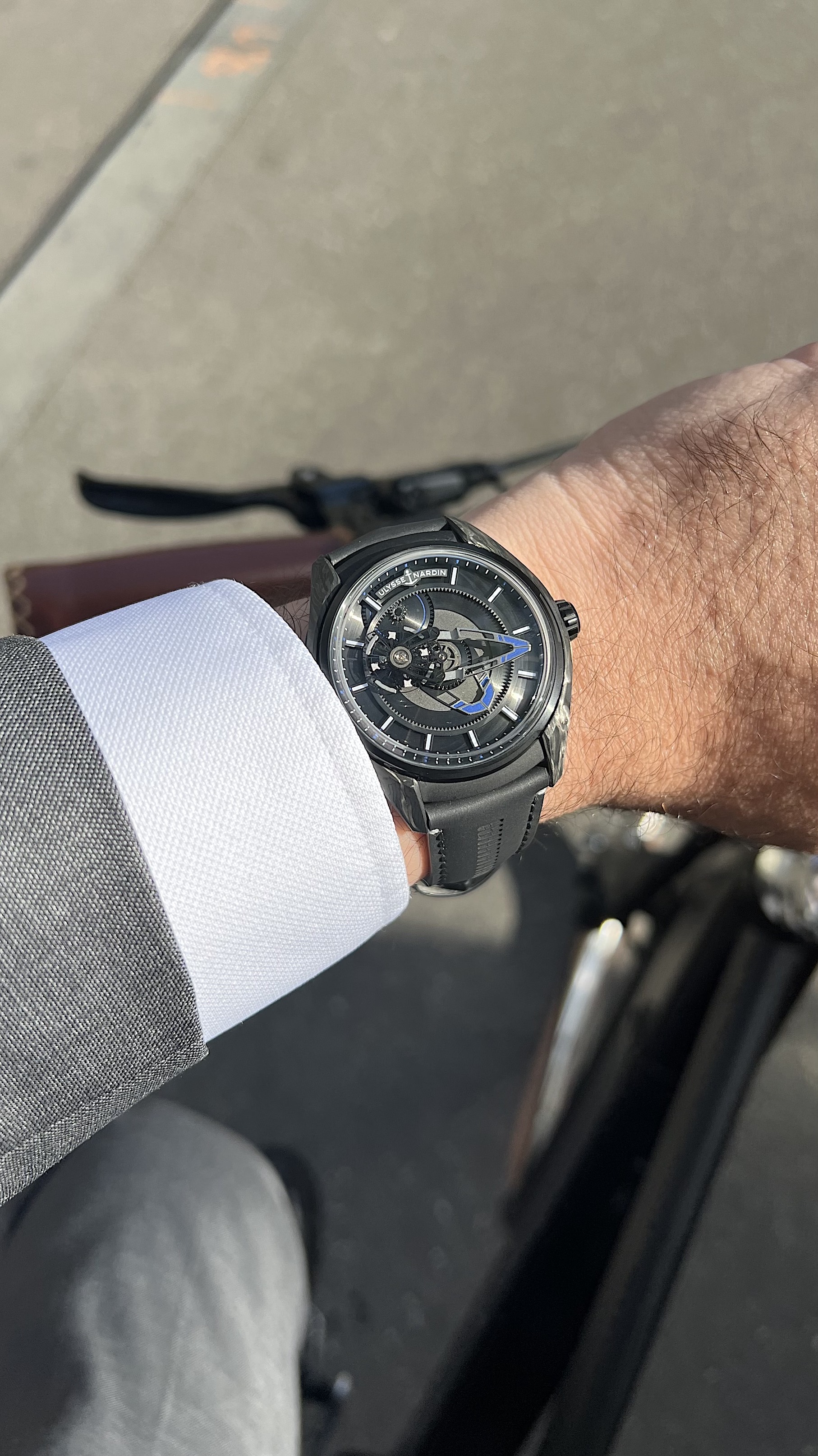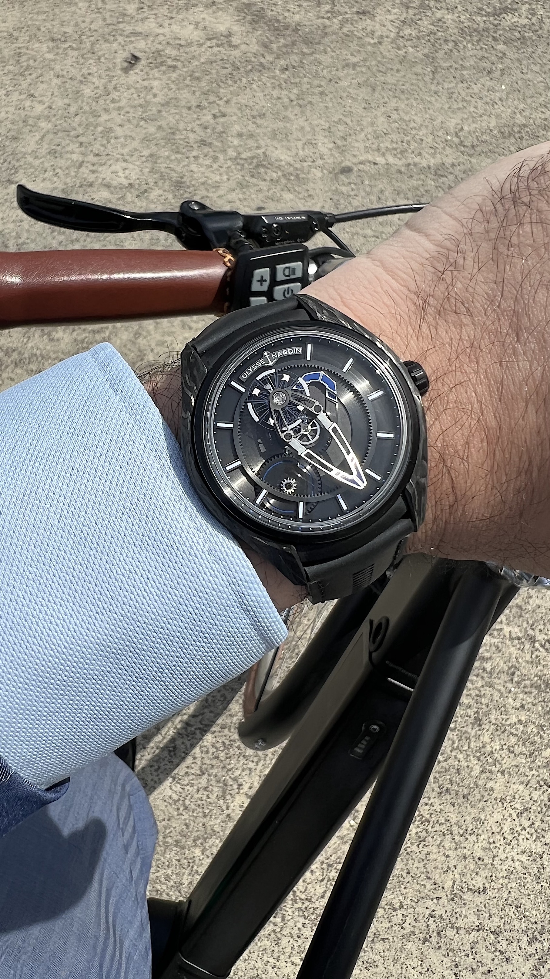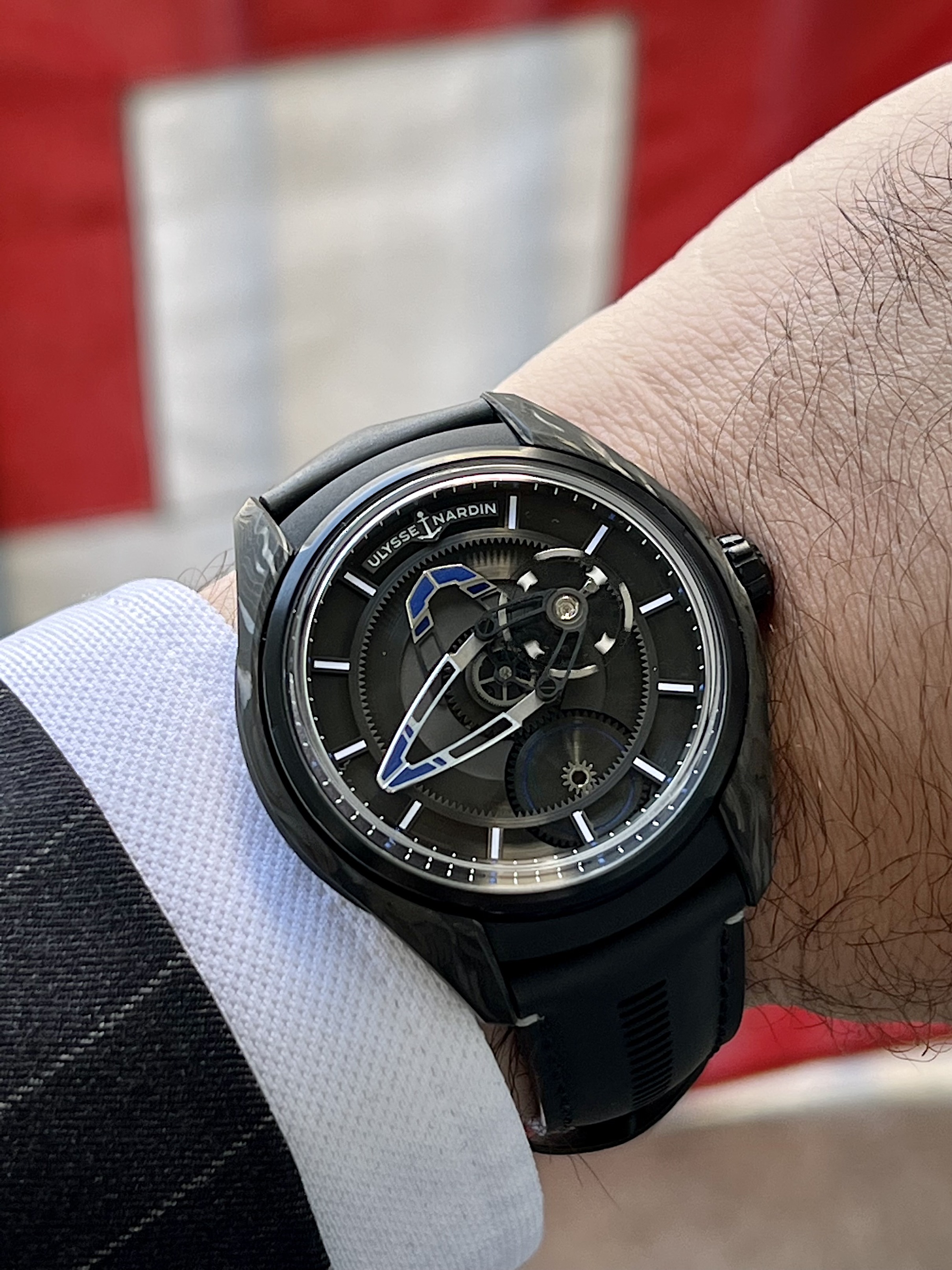 The Freak X is a slimmed down version in terms of movement but also size and price. The case is 43mm but wears very well, pretty much like a Rolex GMT. The watch is very light due to the case in Carbonium (full watch with strap is just 81 Grams).