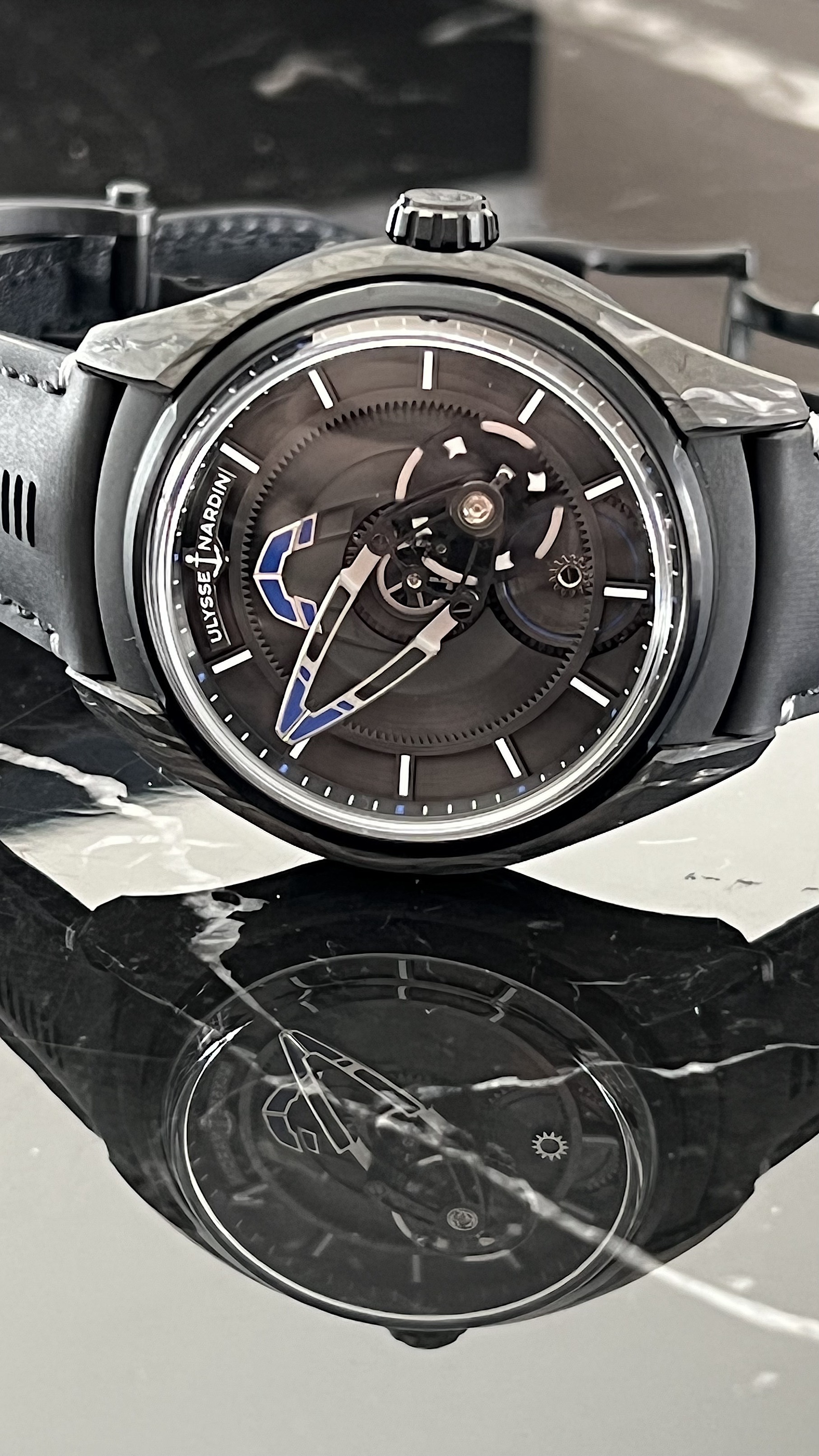 The black dial with blue accents and the carbonium case confers to the watch a very modern look, working both on formal and casual outfits.